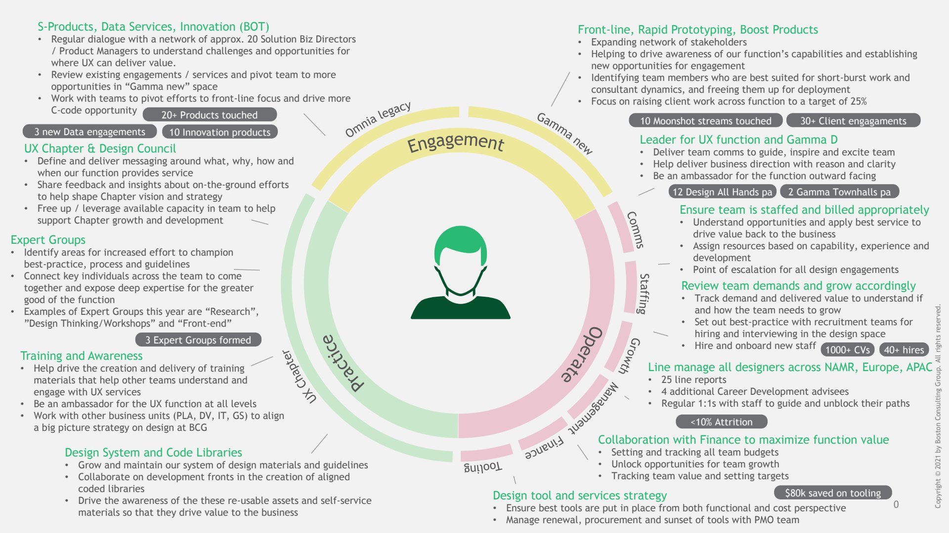 A breakdown of my role leading the UX Design function across 8 offices and 4 continents