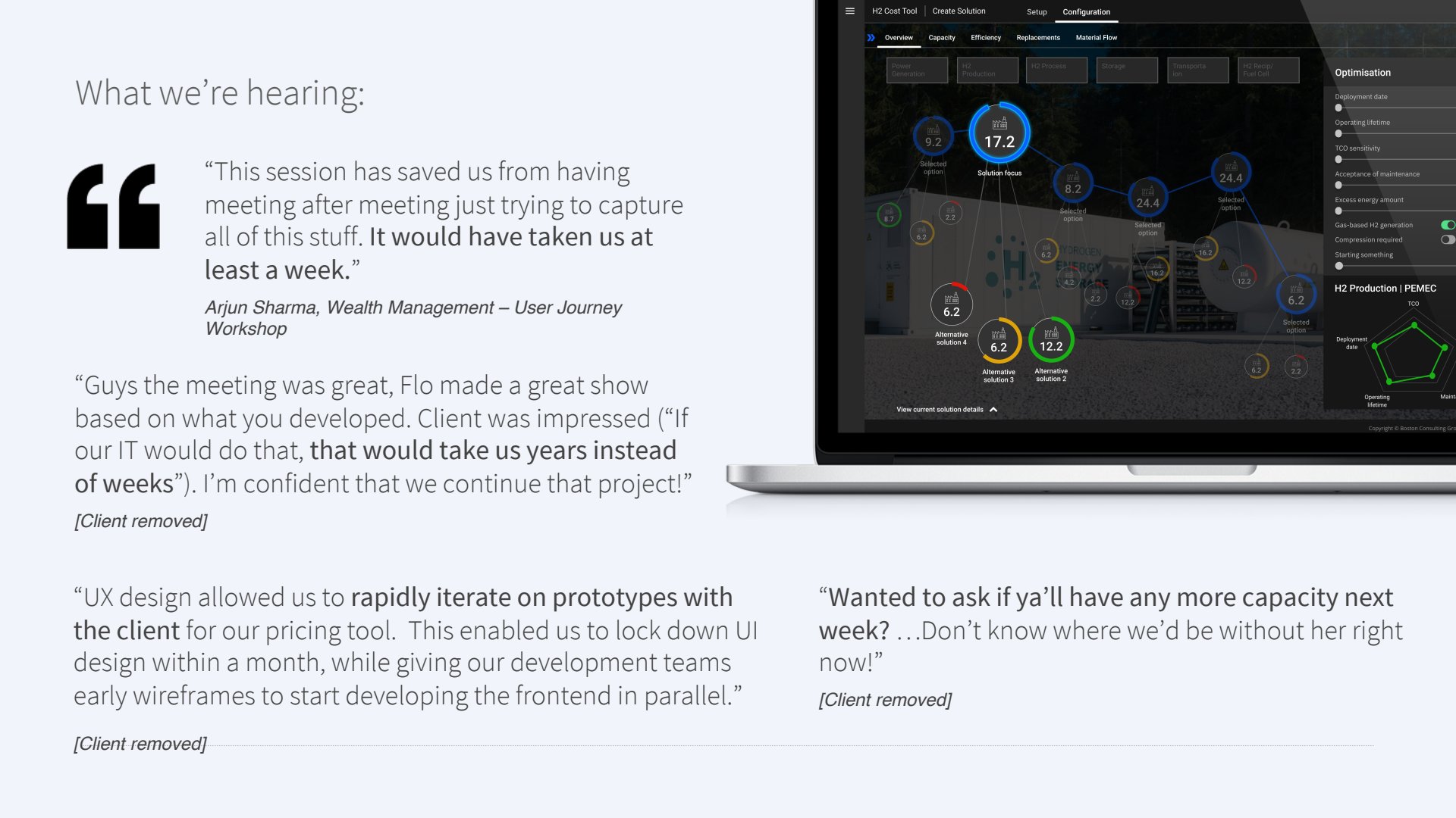 I joined BCG in 2016 with the objective to bring UX Design in-house for their product ecosystem of consultant enabling software. Over the following 7 years of service this led me on a journey of building a team from zero to 25 UX Designers spread across 8 offices and 4 continents with world-wide clients.